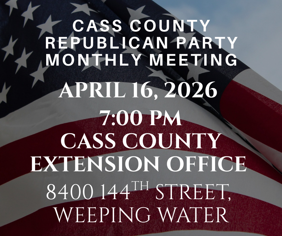 Cass County Extension Office / Meeting Room 8400 144th Street, Weeping WaterThe monthly meeting of the Cass County GOP is scheduled for Thursday, April 16th at 7:00 PM. Location: Cass County Extension Office Meeting Room - 8400 144th Street, Weeping Water NOW IS THE TIME TO GET INVOLVED!! All Cass County Republicans are welcome and encouraged to attend. TOGETHER, we can!!